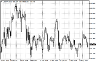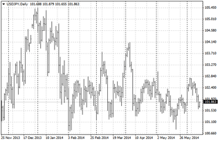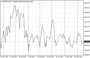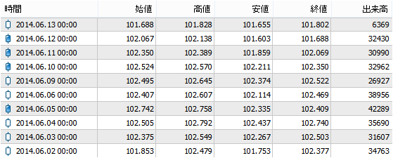以下の表は、MT4のツールメニューからヒストリーセンターを開き、米ドル/円日足の時系列データから2014年6月2〜13日の四本値(始値、高値、安値、終値)を表示したものです。
