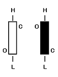 上昇を示す陽線(左側)と下落を示す陰線(右側)