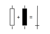 これは、1本目が陽線、2本目が陰線の組み合わせで、2本のローソク足を足し算すると右端に示されるような、始値と終値が同じ価格(同事線)で上ひげが伸びたローソク足となります。これは典型的な反転パターン(上昇から下降への反転)のひとつで、2デイ・リバーサルと言われるパターンです。逆に、安値圏でしばしば見られるものとして陰線+陽線=下ひげが伸びた同事線、というものもあります。