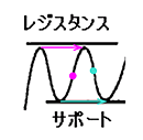 また、左図の水色の丸で示した位置で取引されている時に水色の矢印で示した以前の安値がサポート(支持)となり、こちらは値動きの下値が支えられやすいと判断できます。オーダー等の心理的な働きはサポートも同様です。このサポートとレジスタンスは、もみあいが続き複数回繰り返すと一層参加者に意識されることとなりますので、より強いサポート、レジスタンスとなりますが、逆にそうしたサポート、レジスタンスを抜けると今度は以前のサポートがレジスタンスに、またレジスタンスがサポートになることが多くなるのも特徴です。