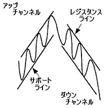 上昇中、下落中のサポート、レジスタンスを結ぶとチャンネルに