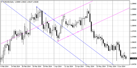 あまり継続性が無く良い例とは言えませんが、ユーロドル日足チャートにダウンチャンネル(青い平行線)、アップチャンネル(ピンクの平行線)を引いた例を示してみました。ラインを引くことでFX相場が読みやすくなります。