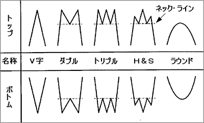 リバーサルパターンの特徴として左右対称の形状となるものが多く、図で示したパターン以外でも左右対称のパターンが出てきた時は注意が必要です。図中、H&Sはヘッド&ショルダーを指します。