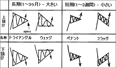 コンティニュエイションパターンは、いわゆる「もみあい」の形状の内、特定の形状を示した場合に、もみあいに入る前のトレンドがもみあい後に再開する可能性が高いパターンを言います。日本語では「三角保ち合い」とも。コンティニュエイションパターンは長期で形成される(日足の本数でおおむね1〜3か月程度)パターンと短期で形成される(日足の本数でおおむね1〜3週間程度)パターンに分けられ、長期で形成されるパターンは稀にしか見られませんが、もみあいを抜けるタイミングとしては頂点(apex)の手前、8合目あたりで抜けると大きな動きに繋がることが多いです。