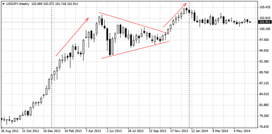 以下のチャートは、米ドル/円週足チャートですが、コンティニュエイションパターン(トライアングル)が形成され、パターン通りに上昇を再開した教科書通りの例と言えます。