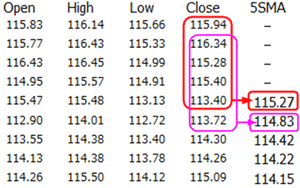 移動平均線とは、言葉通り一定期間の価格の平均で、平均値をひとつずつずらして計算することでローソク足の上下に曲線で表示されるテクニカル指標です。基本は終値の単純平均となりますので、終値をn期間分合計しnで割るだけで移動平均を求めることが出来ます。例として右の表をご覧ください。四本値の内、終値(Close)の5日分を合計し5で割った値が移動平均として右の5SMAという列に表示されています。赤枠で囲んだ5日間ならば赤枠で囲んだ5SMA、ピンクで囲った5日間ならばピンクで囲った5SMAが対応しています。計算自体は非常にシンプルです。