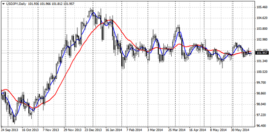 通常は短期のパラメータと長期のパラメータを組み合わせて使うことが多く、ローソク足に2本、もしくは3本の移動平均線を組み合わせたチャートは新聞等、各所で見ることが出来ます。今回は、移動平均線の基本編ということで日足チャートに2本の移動平均線を表示した典型的な移動平均線のチャートを読む練習をしましょう。次のチャートはドル円日足に5日(1週間の取引日数)と21日(1か月の取引日数)の移動平均線を表示したものとなっています。青い線が5日移動平均、赤い線が21日移動平均です。