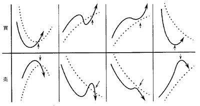 2本の移動平均線からわかることは、2本の移動平均線の方向と位置関係によって、その時点におけるトレンドと売買タイミングを知ることが出来ます。