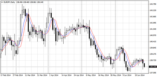 5日終値移動平均線を青、5日始値移動平均線を赤で表示したユーロ円日足チャートをご覧ください。