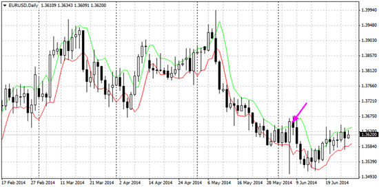 高値移動平均と安値移動平均の組み合わせも見てみましょう。この組み合わせでは移動平均線どうしがクロスすることは無くローソク足の上下にバンドのように移動平均線が表示されるのが特徴です。次のチャートはユーロドル日足チャートに3日高値移動平均と3日安値移動平均を表示し、それを1日先行表示(MT4では表示移動に+で入力すると先行、−で入力すると遅行の表示が可能。今回はそれぞれに1を入力)させています。1日先行させる理由は最後のローソク足はライブレートですから、5分足のようなザラ場チャートではレートが変化すると移動平均線の値も変化してしまうためです。あえて1日先行表示させることで2日前から4日前のレートを使った移動平均が表示されますので、移動平均の値は変化しないことになります。
